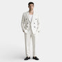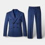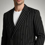 This men’s two-piece suit set features a double-breasted blazer paired with matching pinstripe trousers for a sharp, tailored presentation. The blazer shows a six-button front, notch lapel collar, chest welt pocket, and flap pockets, all aligned with vertical pinstripes that create a clean visual line. The trousers mirror the same stripe pattern with a straight-leg silhouette and waistband belt loops. Worn together or styled separately with shirts or knitwear, the set adds a refined, structured element to an outfit.