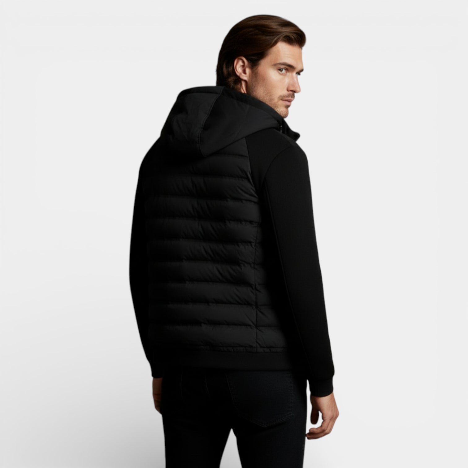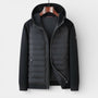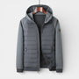 This men’s hooded zip-up jacket presents a refined, clean look with quilted front panels set against smooth contrast sleeves. The design features a fixed hood, a full-length front zip, and visible zip pockets along the front panels for a streamlined appearance. The silhouette reads as regular fit based on the straight drape through the body and sleeves. Layer it over a tee or knit with denim or tailored trousers for flexible outfit-building.