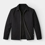 This men’s zip-up jacket presents a clean, modern look defined by a structured point collar and streamlined front closure. The smooth exterior keeps the design minimal, while angled welt pockets and subtle hem shaping add refined visual balance. The silhouette appears straight and regular through the body for a neat profile. It pairs naturally with denim, trousers, or layered outfits for a composed, put-together look.
