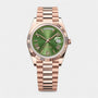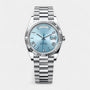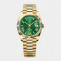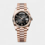 - Display: Roman numeral dial with luminous hands and markers; day and date windows