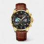 Refined and functional, the Vintares Quartz Watch pairs timeless elegance with everyday reliability. Its 42 mm stainless steel round case, 11 mm thick, is fitted with hardened glass for clarity and resilience. The dial features Roman numeral markers with luminous detailing and three-eye chronograph timing for added practicality. At just 52 g, the watch is lightweight on the wrist, complemented by a 22 mm leather strap that extends to 240 mm for a comfortable fit. Powered by quartz precision and rated to 3 ATM water resistance, it delivers both durability and style for fashion-forward wear.